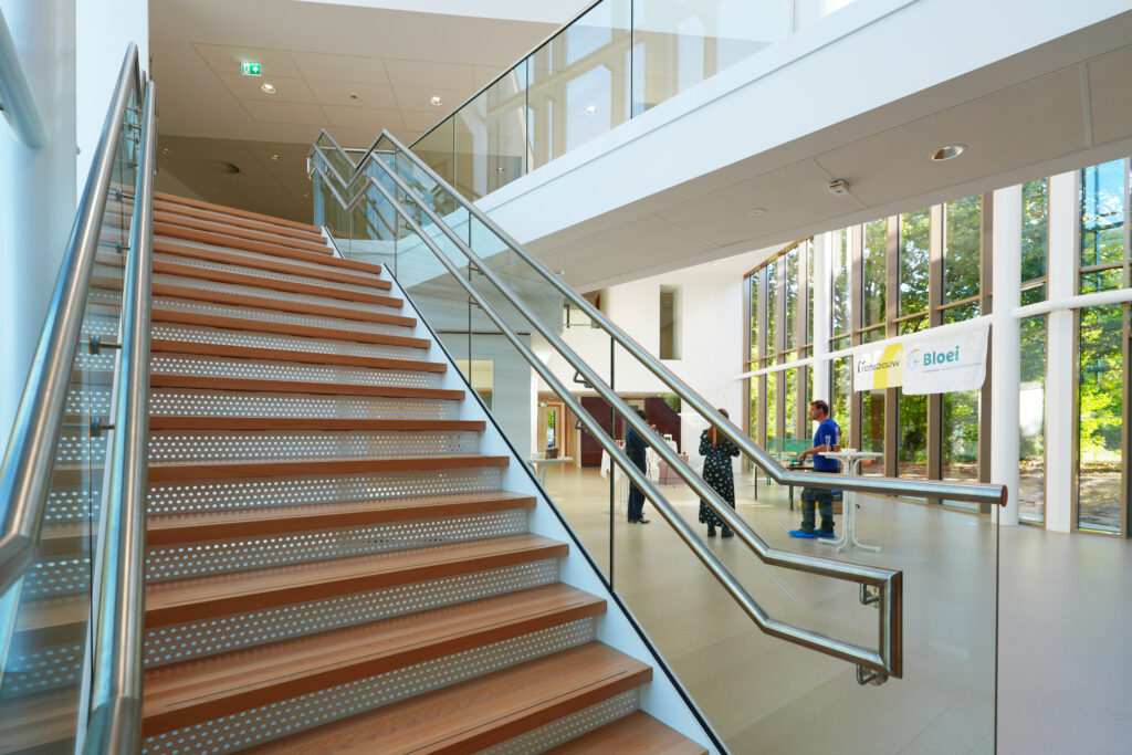 Het gebouw is opgetrokken in houtskeletbouw met houten gevelbekleding. Op de vloeren ligt natuurrubber. Grote ramen tot op de vloer verbinden binnen en buiten. Triple glas zorgt voor thermisch comfort. Elke klas op de begane grond heeft een eigen uitgang naar buiten. Aan de gevels komen verticale tuinen en in het atrium groeit straks een echte boom. “Het is open, ruim en licht, maar tegelijk geborgen en vol mogelijkheden,” zegt Marije trots. Buiten verrijst een ontdekbos met een theatertrap voor buitenlessen. Regenwater wordt opgevangen in kleine wadi’s die bijdragen aan een gezonde waterhuishouding én speelplezier.